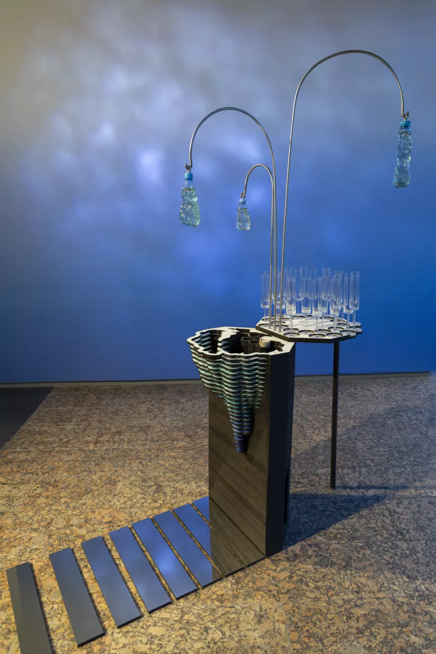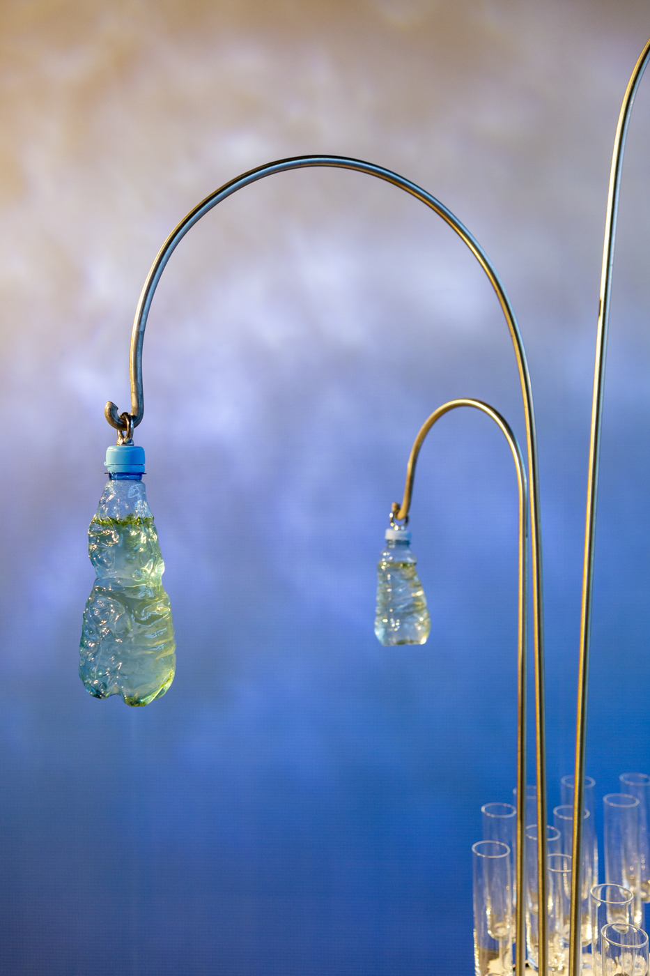Die beschriebenen Aspekte greift Marike Schreiber, deren künstlerisches Interesse u.a. den Formen wissenschaftlicher Abbildungen und in Bilder übersetzten Daten, Modellen und metaphorischen Begriffen gilt, auf und überführt diese in skulpturale Arbeiten, die im Rahmen des artist-led field trip genutzt und nun im Ausstellungsraum in einer Rauminstallation gezeigt werden. Sowohl die Medaille als auch die Bar für einen Wasserempfang finden sich wieder. Die ikonische Friedenstaube sitzt jedoch nun und spielt so auch auf den Systemwechsel an, der das Ende des 1990 abgeschalteten Kernkraftwerks bedeutete. Die Bar-Skulptur besteht aus mehreren Elementen, die durch drei Stäbe verbunden sind und die Tiefenschichten des Stechlinsees darstellen. Die Anordnung der Gläser auf der Bar und die achteckige Form der Bar selbst beziehen sich auf die Anordnung der 24 Seezylinder des Seelabors im Stechlinsee. Die Behälter mit Seewasser verweisen auf die Diskrepanz zwischen dem über Jahre verunreinigtem und dennoch als sauber geltenden Wasser des Stechlinsees. Bei Führungen in der Ausstellung wird die Bar aktiviert und die Besucher_innen zum Wasserempfang eingeladen.